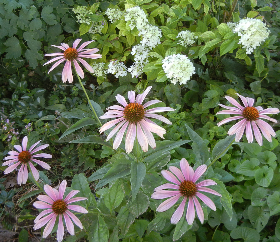 I included Lady's Mantle, alchemilla, because it does reseed generously, forming large round-leaved plants throughout the shade garden. The blooms are uninspiring yellow green, but the green mounds of leaves are welcome under the trees.